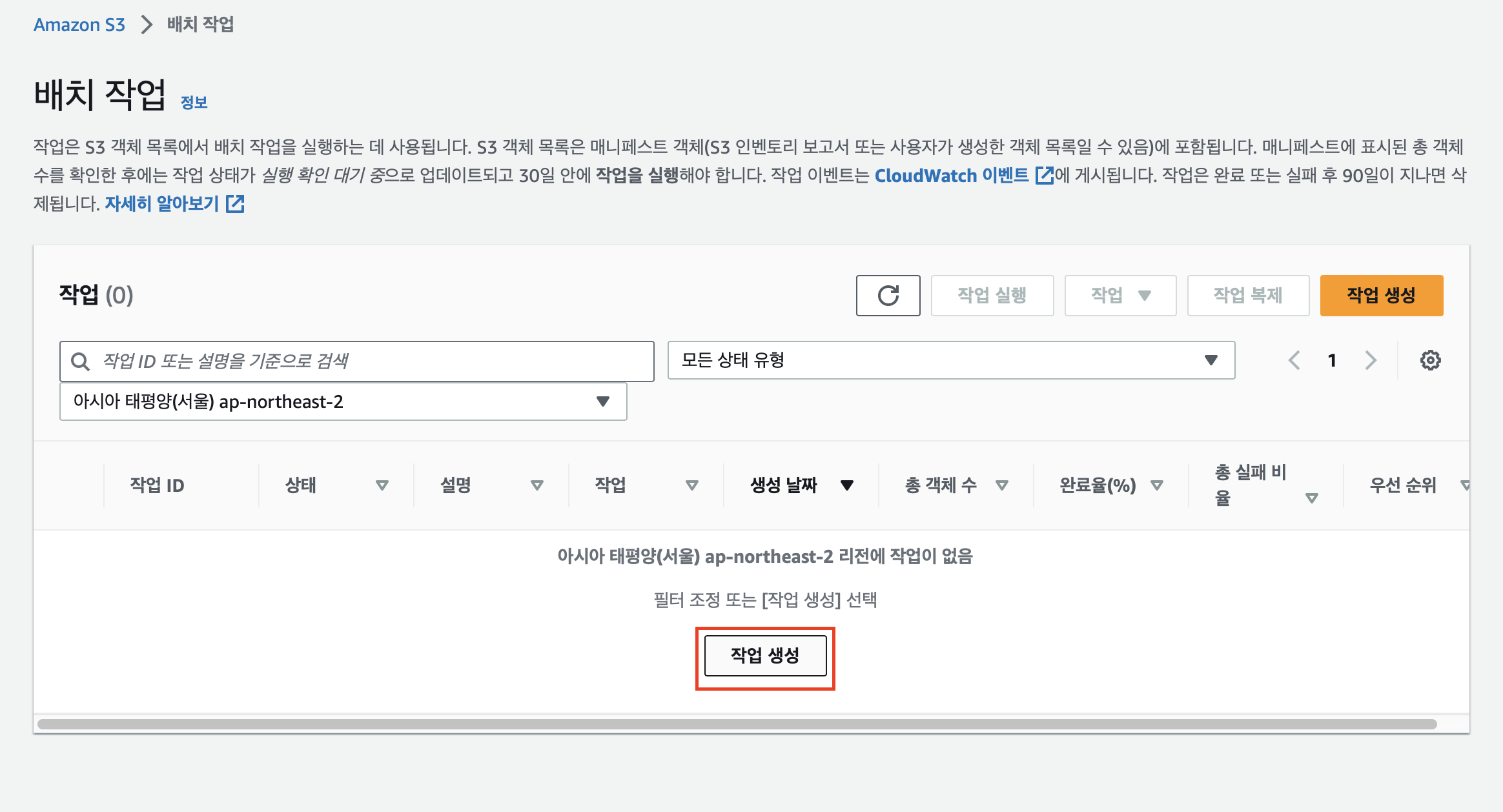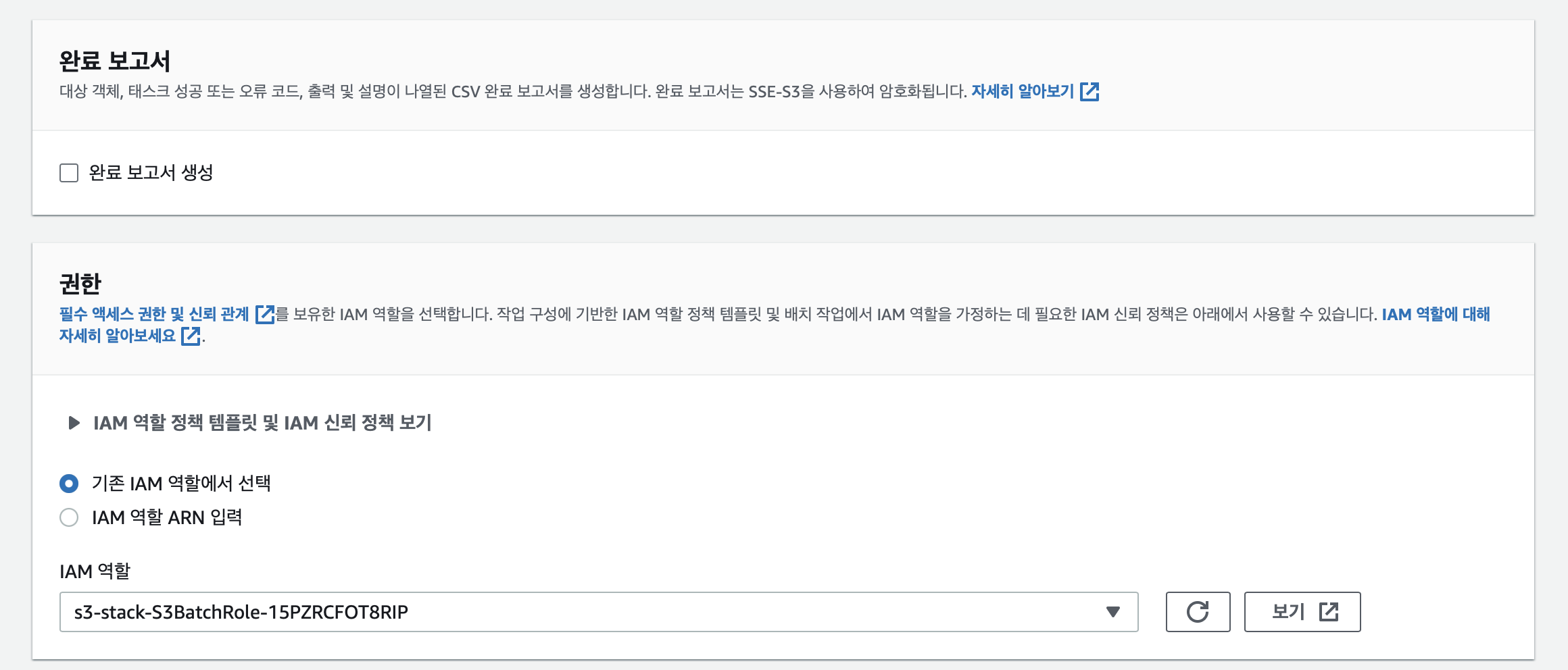 완료보고서는 생성하지 않고, IAM 역할은 S3BatchRole 이 포함된 역할로 선택해줍니다.