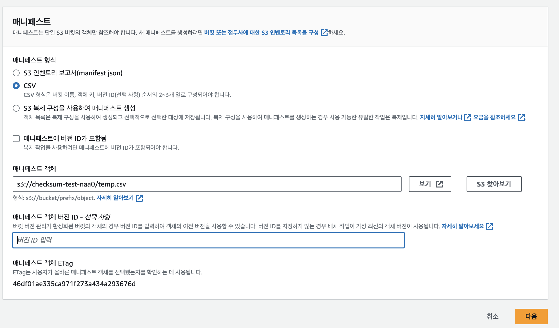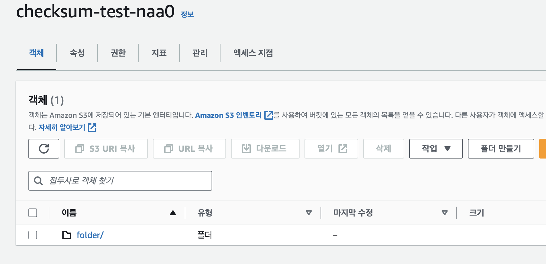 체크섬 추가를 위한 환경 셋팅을 위해 aws cli를 활용하여 S3 버킷을 생성하고 object를 업로드 하였습니다.