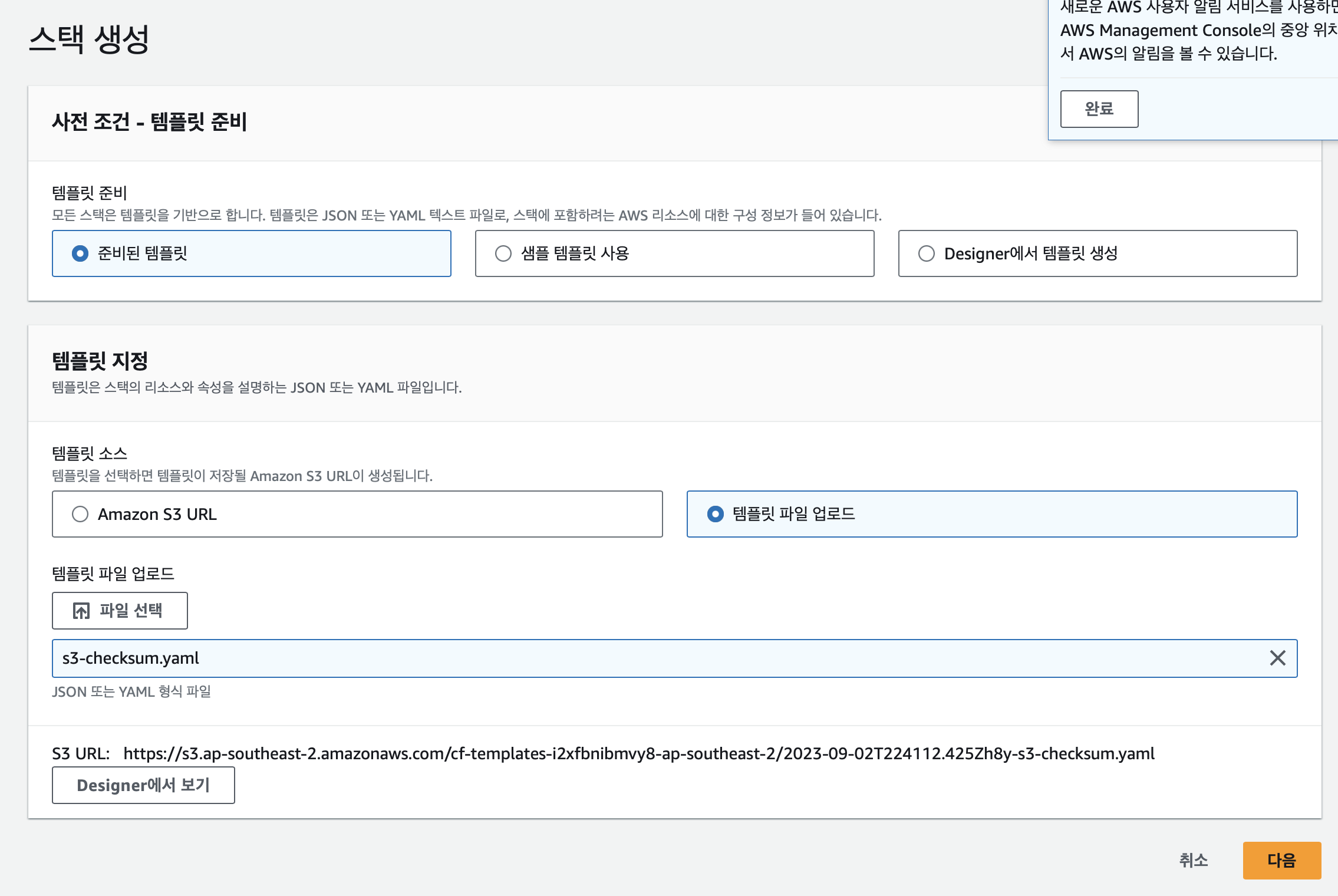 준비된 템플릿에서 해당 yaml 파일을 업로드 해주고, 다음을 클릭합니다.