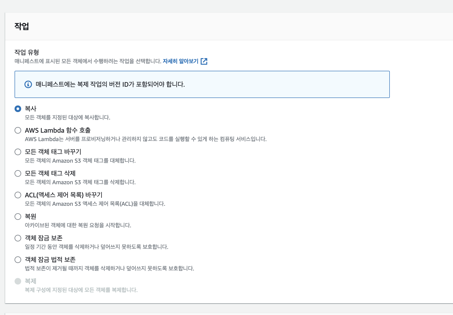 S3 왼쪽 패널에는 '배치작업' 이라는 메뉴가 있습니다. 이제 이걸 클릭해줍니다.