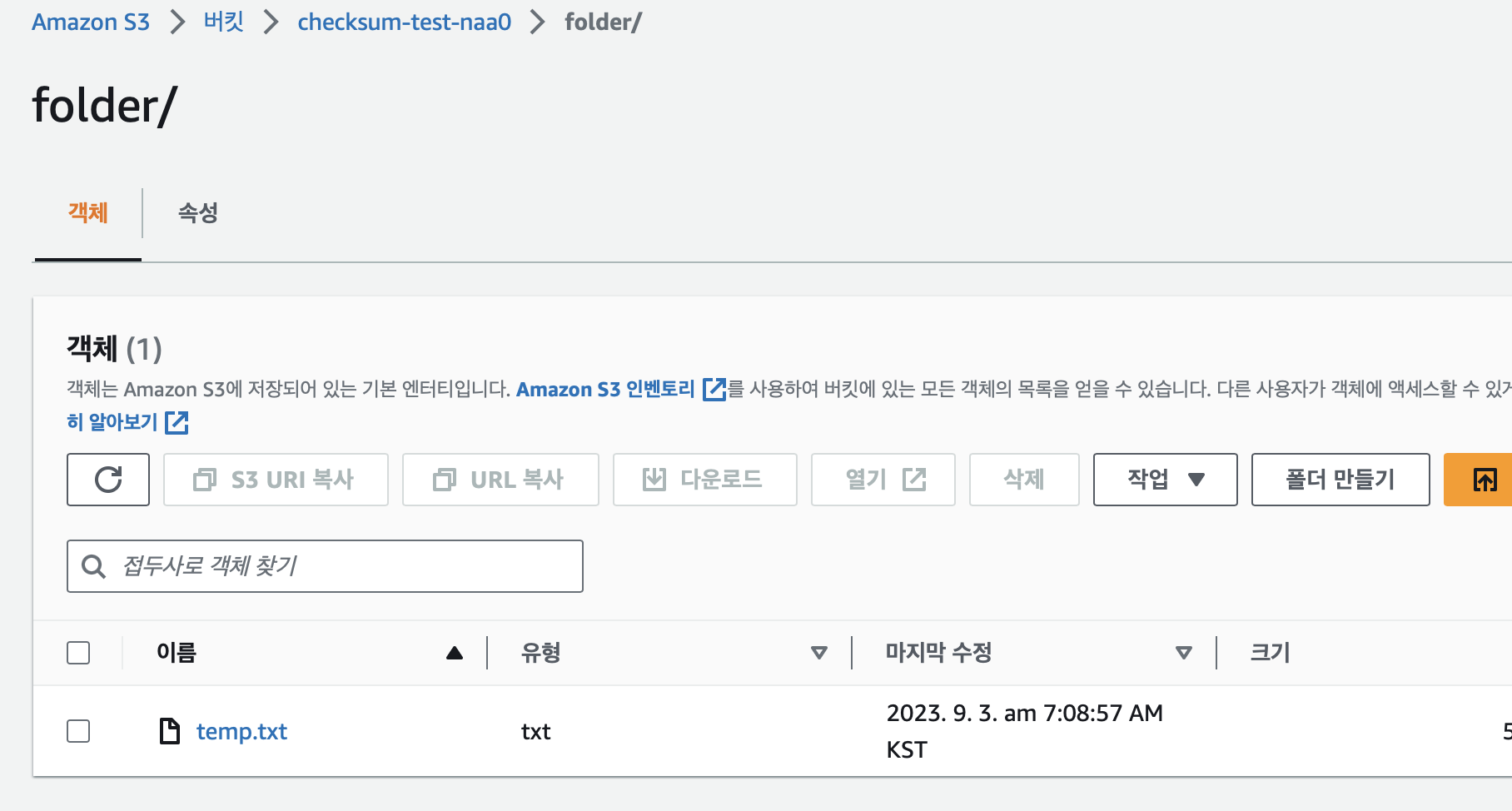 % aws s3 cp temp.txt s3://checksum-test-naa0/folder/ --profile nykupload: ./temp.txt to s3://checksum-test-naa0/folder/temp.txt