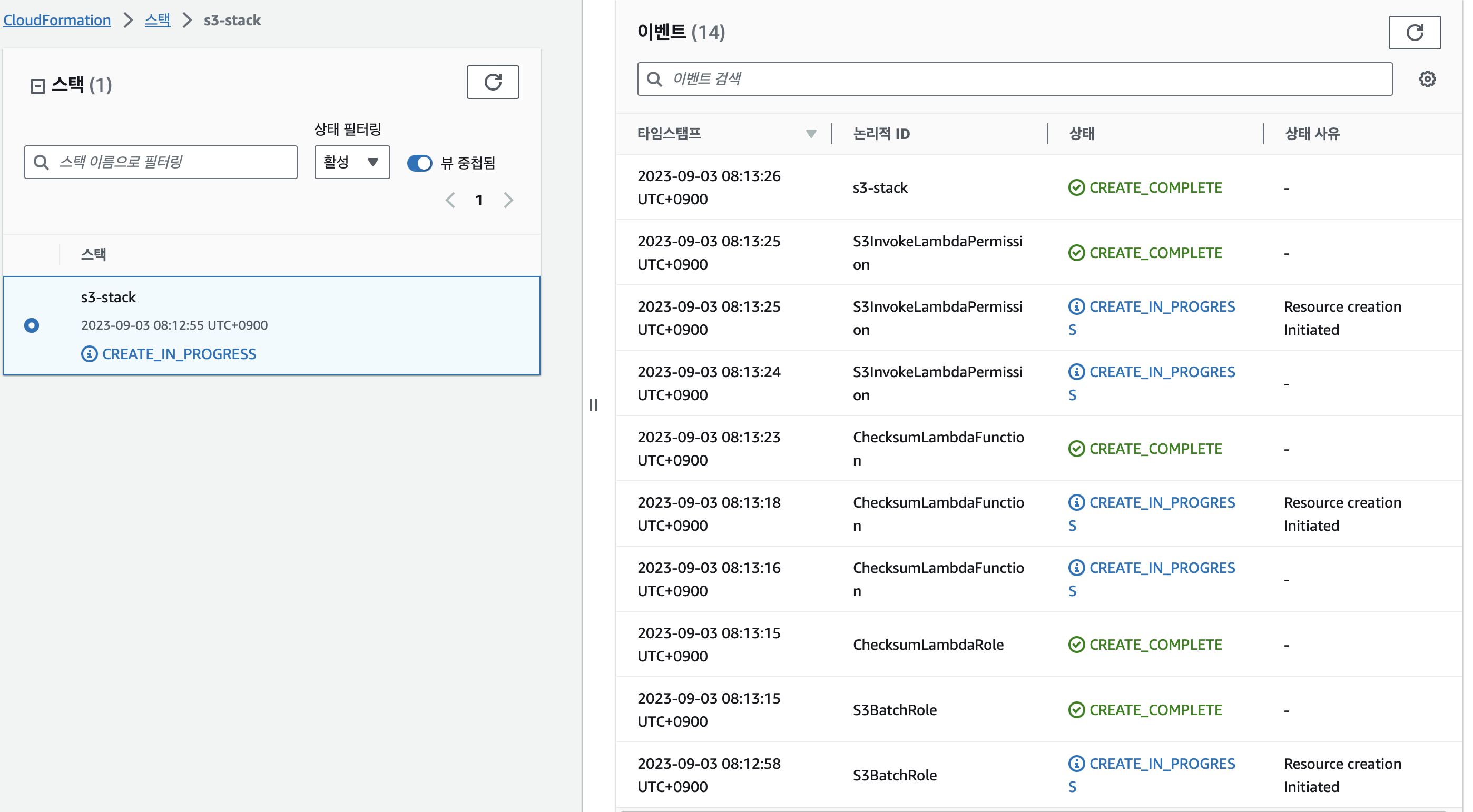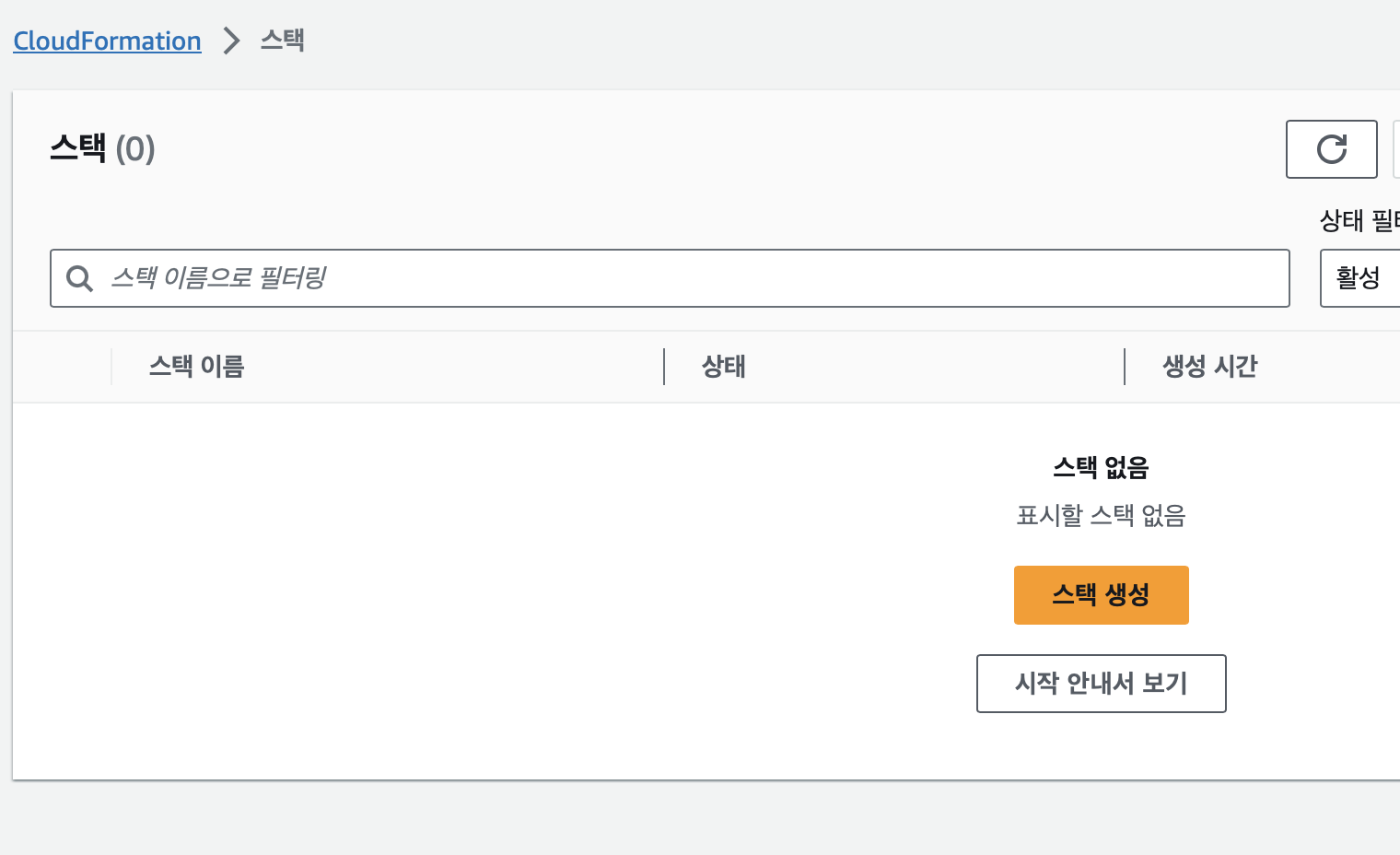 다시, cloudformation 스택으로 돌아가서 아래의 화면에서 스택생성을 눌러줍니다.
