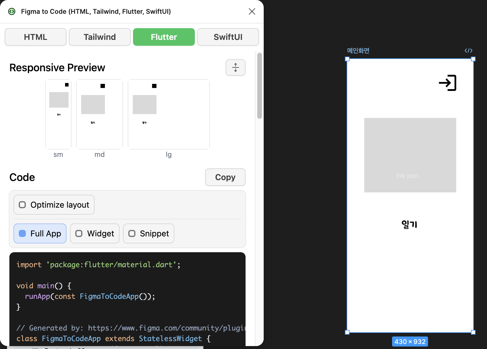 - 플러그인 실행 후 Flutter 클릭 시 Flutter 코드로 뽑기 가능