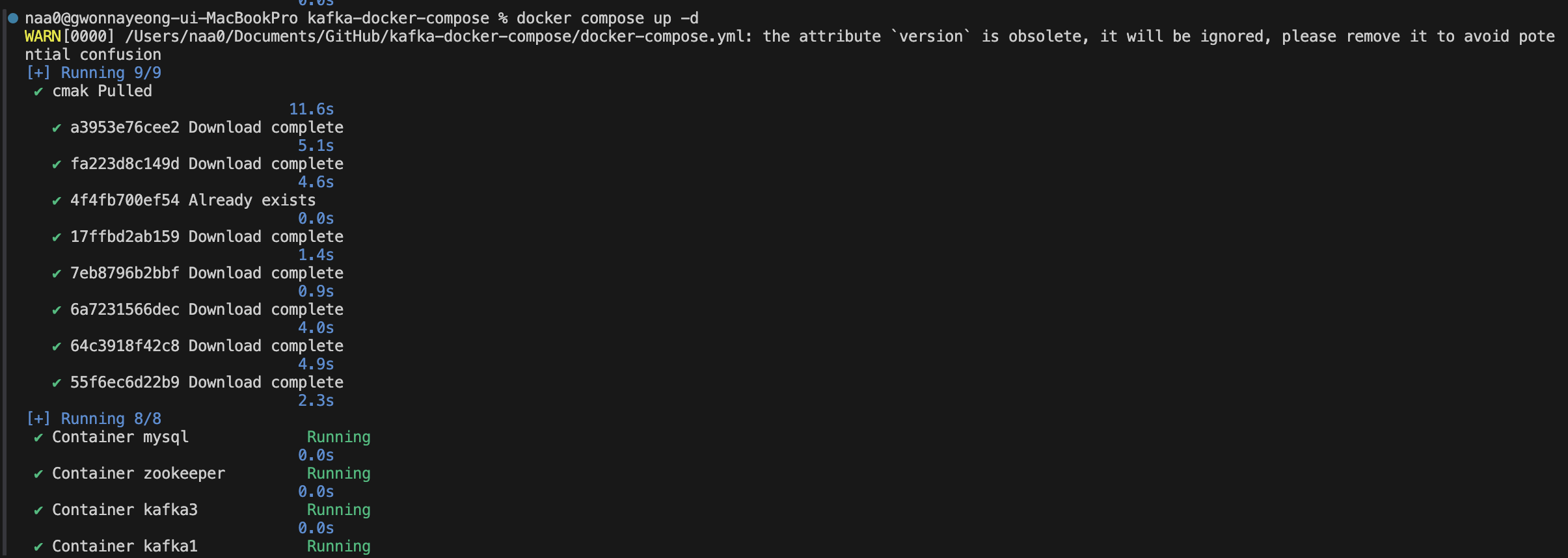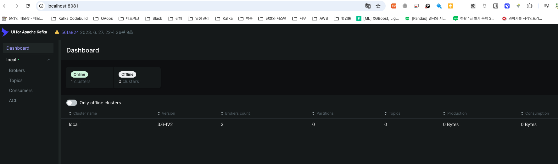 - 실행이 완료되면 Zookeeper와 Kafka 브로커 3개, Kafka UI가 컨테이너로 실행된다.