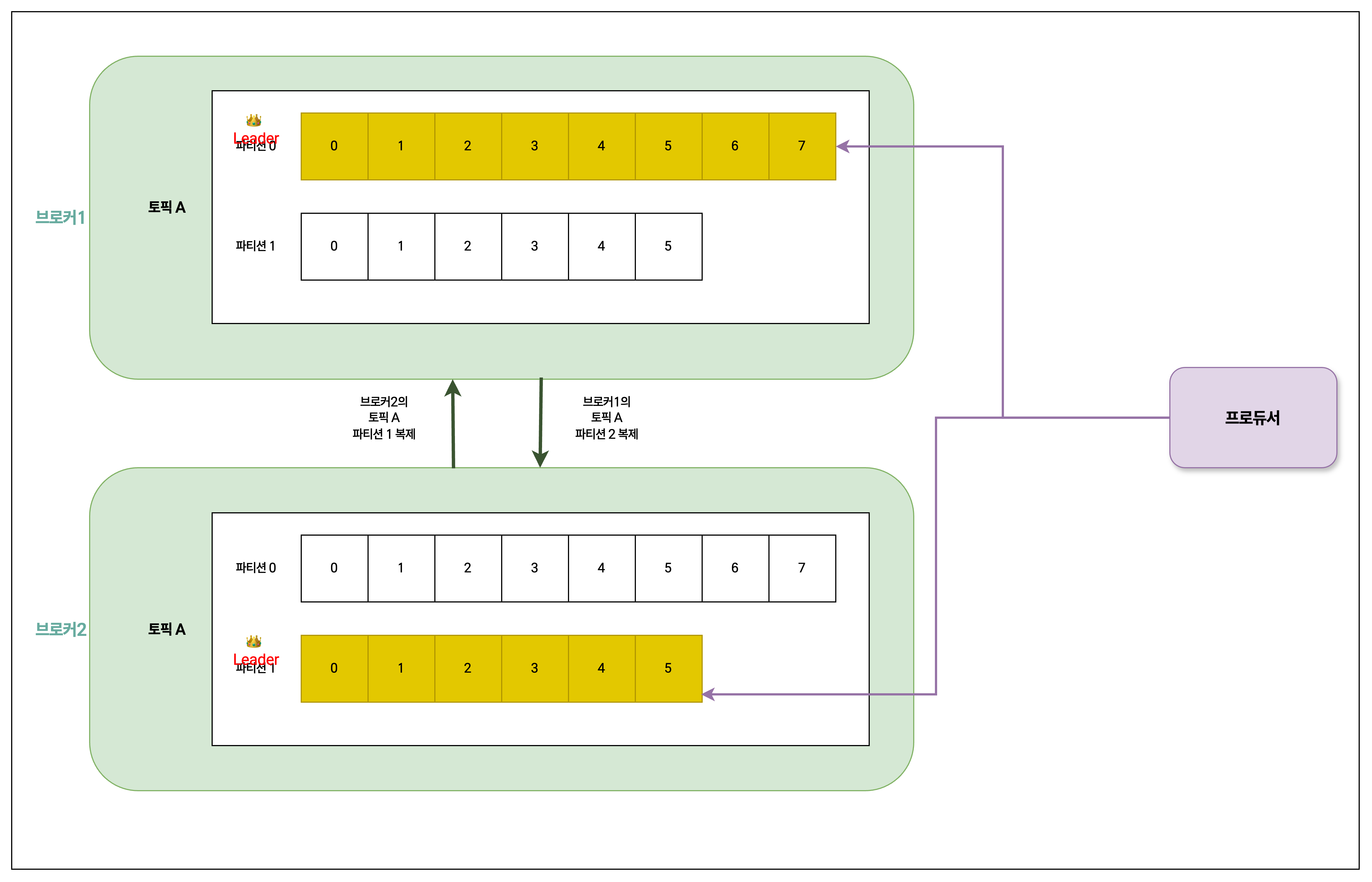 - 나머지는 팔로워. 파티션의 메시지를 중복 저장(복제)하여 리더 브로커에 장애가 발생했을 때 리더를 이어받을 수 있도록 함.