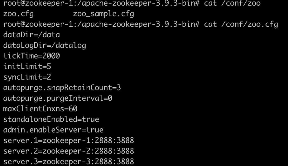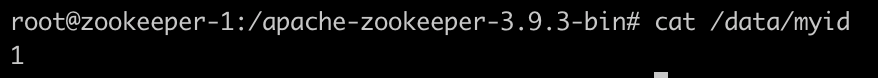 docker exec -it zookeeper-1 bash통해 서버 접속. - data 디렉토리 하위 myid에서 주키퍼 id 확인 가능